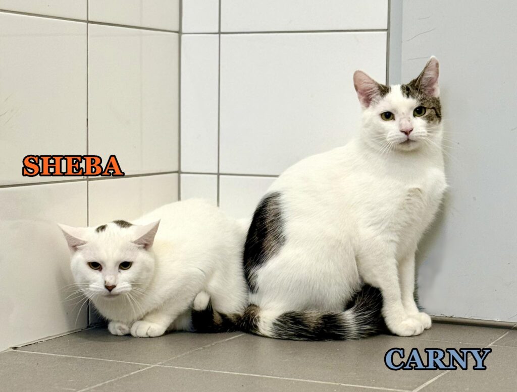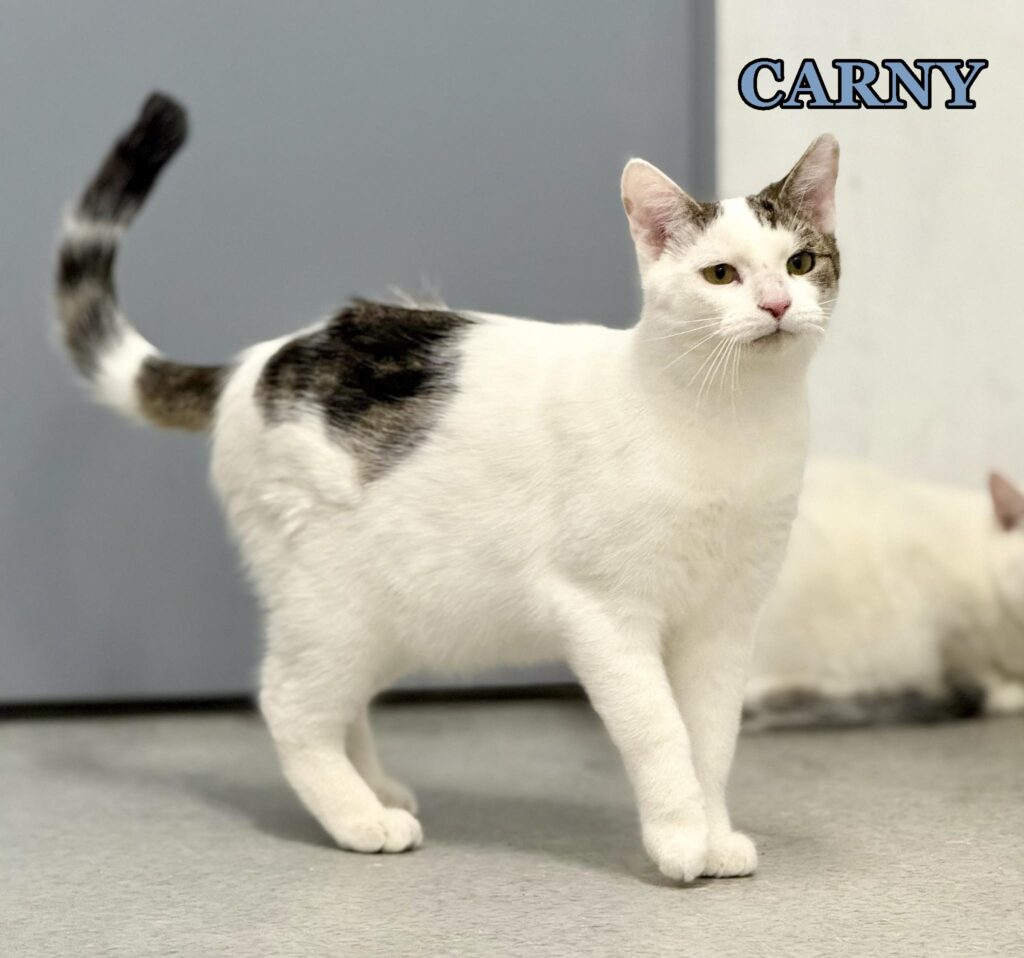 Carny to kotek z trójki rodzeństwa – biało-bury przymilny i kontaktowy kocurek, najbardziej otwarty z całej trójki. Wszystkie trzy (Carny, Animonda i Sheba) są wykastrowane, zaszczepione i odrobaczone.