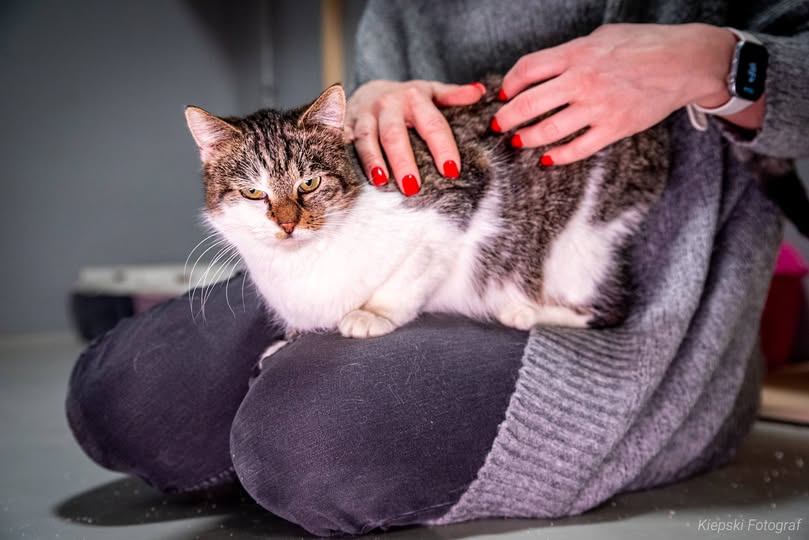 Kicia wręcz czeka, by wskoczyć na kolanka i ułożyć się wygodnie! Jest bardzo przyjazna człowiekowi i trochę też o niego zazdrosna, więc potrafi przepędzić konkurencję, by mieć człowieka na wyłączność. Zaprzyjaźniona z wolontariuszką, pozwala się głaskać i przytulać. Lubi się też pobawić.