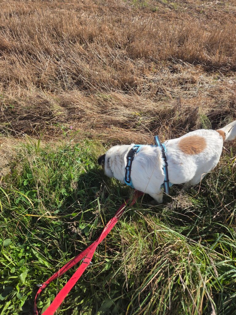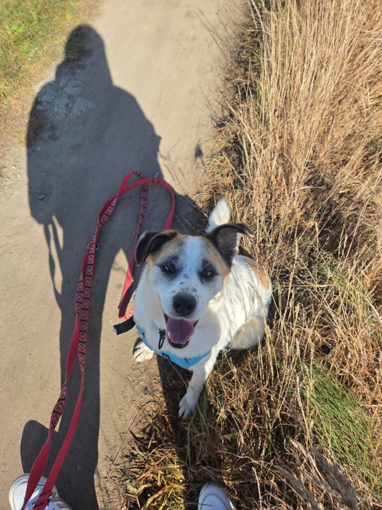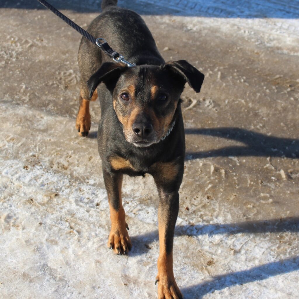 To psiak, z którym dopiero się poznajemy. Przez kraty jest pocieszny, miło nastawiony, łakomy na smaczki i radośnie reagujący na człowieka, jednak próba podpięcia na smycz bardzo go przeraża I wprawia w panikę.
