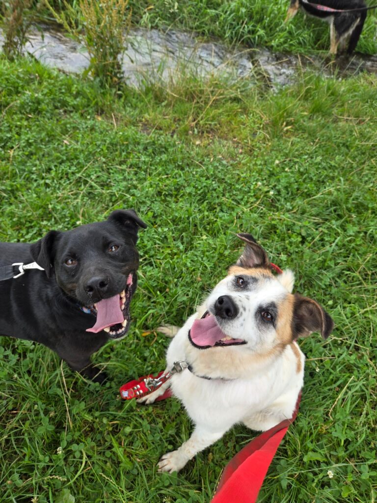 Obie są przestraszone, obie w trakcie socjalizacji: nie potrafią chodzić na smyczy i boją się człowieka, choć starają się czasem nieśmiało nawiązać jakąś interakcje. Na razie nie wychodzi im to zbyt dobrze.