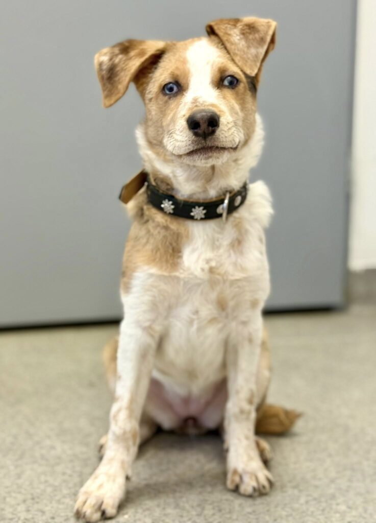 Ciekawie umaszczona Wega z niebieskim okiem trafiła do schroniska w początkach września 2025 wraz z drugą suczką Winą – jako odnalezione w miejscowości Witkowo w gminie Smołdzino.
