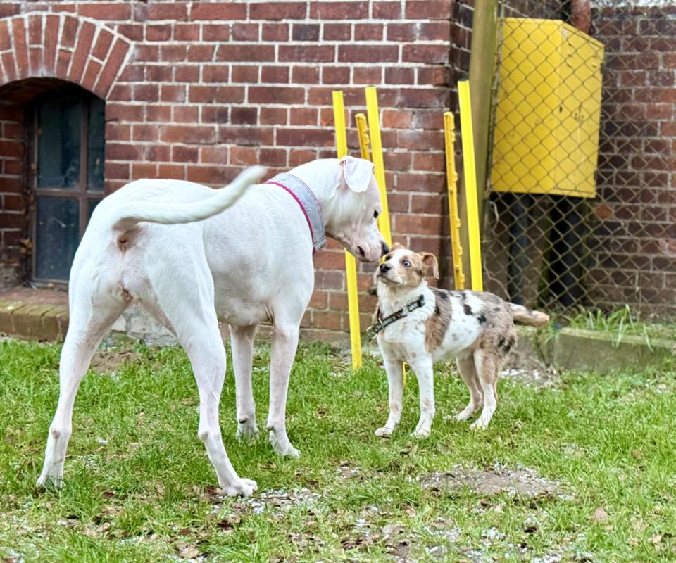 Obie są przestraszone, obie w trakcie socjalizacji: nie potrafią chodzić na smyczy i boją się człowieka, choć starają się czasem nieśmiało nawiązać jakąś interakcje. Na razie nie wychodzi im to zbyt dobrze.