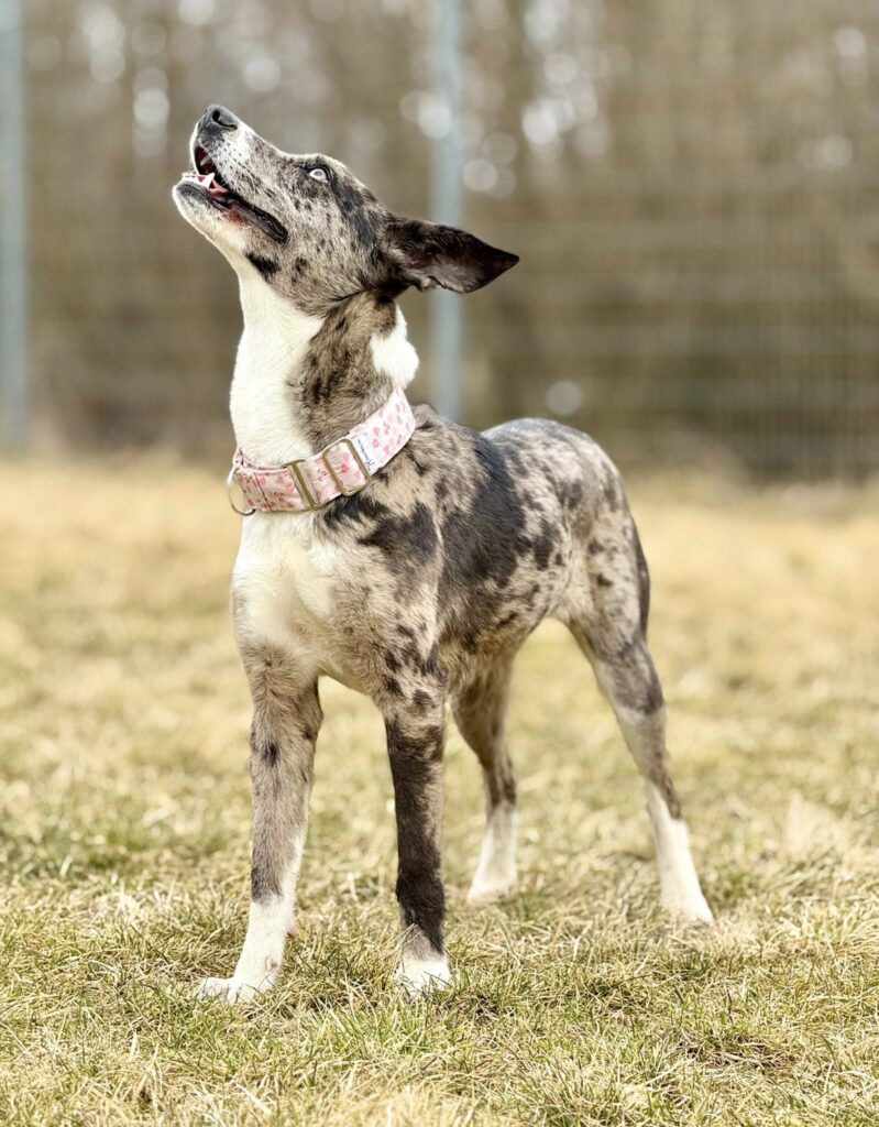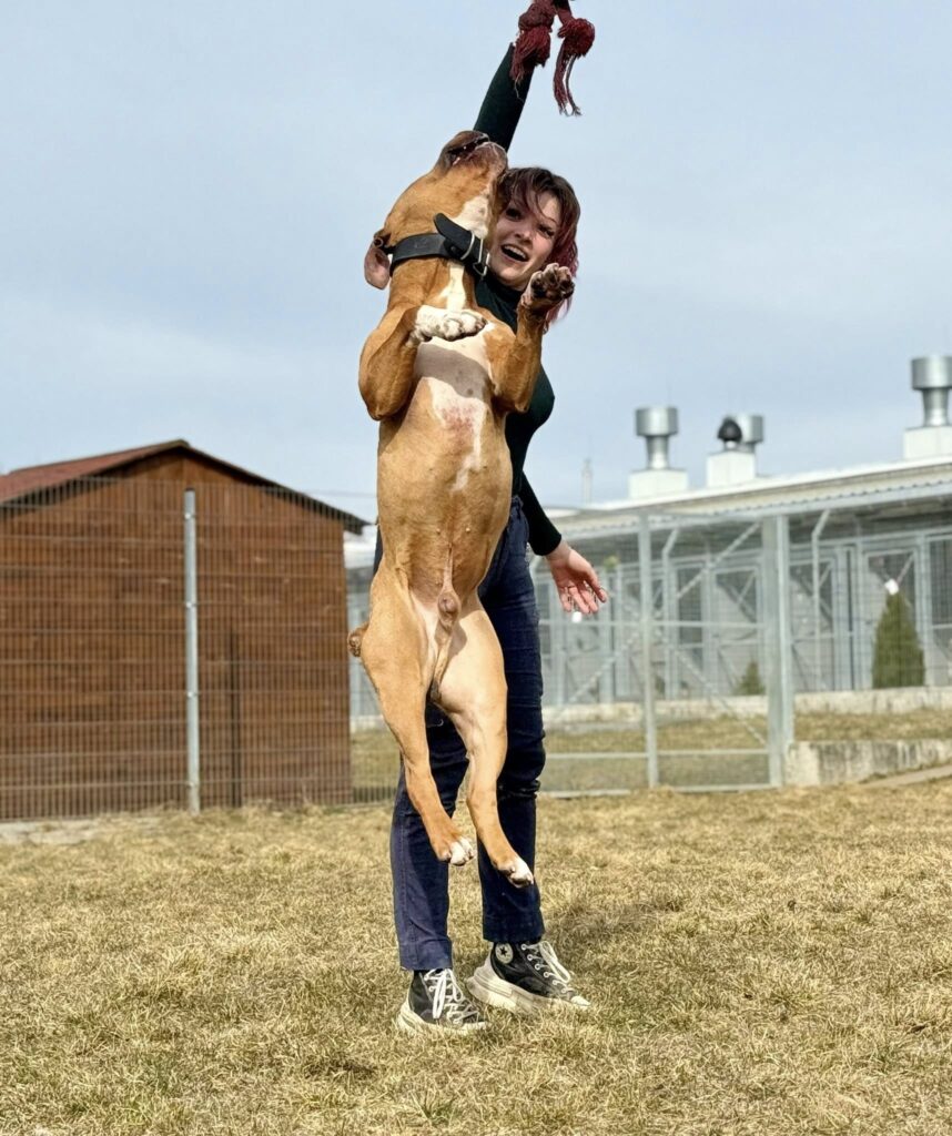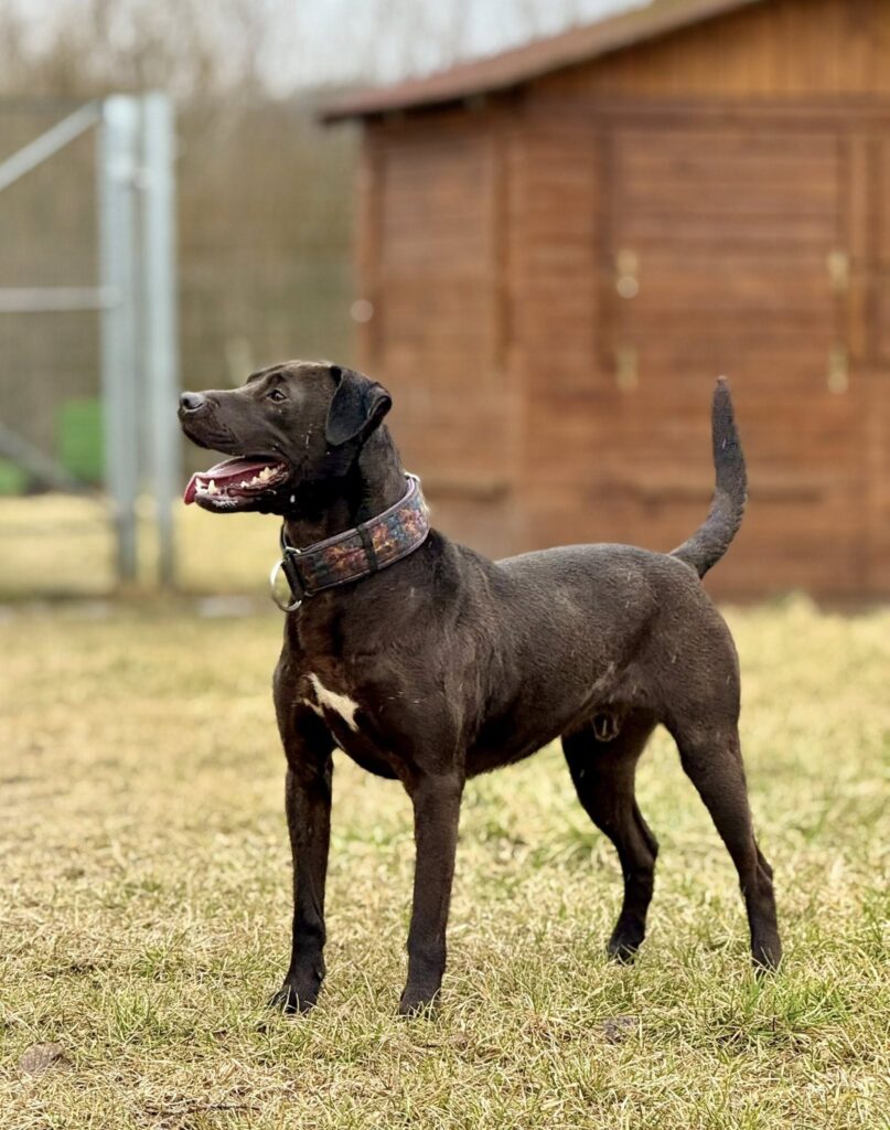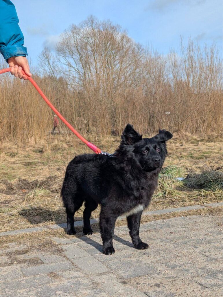 Wina urodzona ok. 2023 waży ok. 13 kg i obecnie już się oswoiła z warunkami schroniska. Na spacerach ciągnie jak parowóz i zdecydowanie potrzebuje nauki chodzenia na smyczy, bo wręcz ją rozsadza nierozładowana energia. Gdyby miała warunki do biegania i swobodnych szaleństw, to na pewno byłoby inaczej.