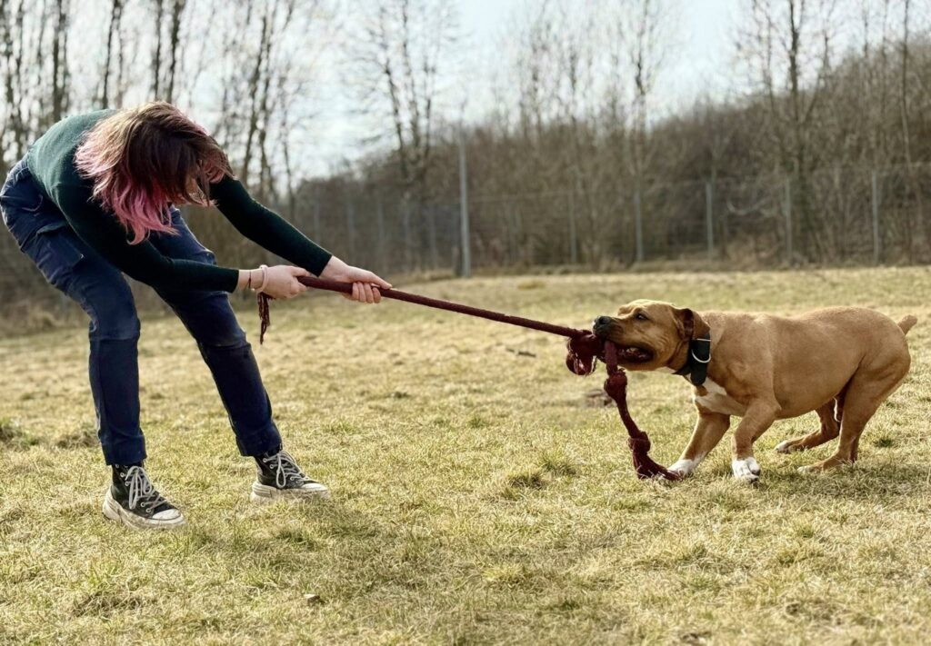 Potrzebuje czasu by zaufać- a jak to zrobi to przedstawia standardową naturę amstaffa: tylko mnie kochaj, nie znam swojej siły, chodźmy się bawić i szarpać! Łasy na smakołyki, zna kilka podstawowych komend.