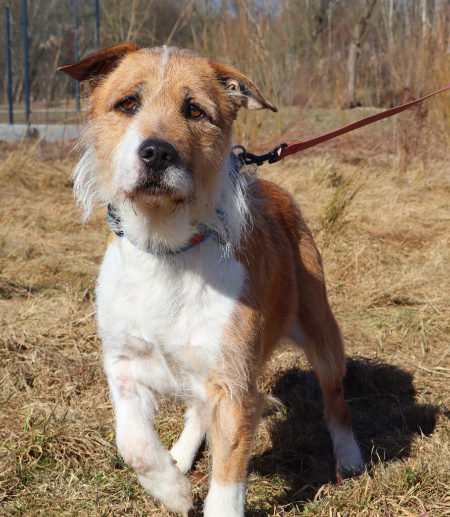 To psiak, z którym dopiero się poznajemy. Przez kraty jest pocieszny, miło nastawiony, łakomy na smaczki i radośnie reagujący na człowieka, jednak próba podpięcia na smycz bardzo go przeraża I wprawia w panikę.